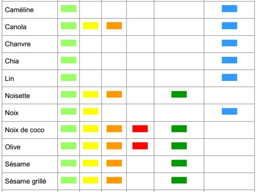 Tableau résumé des différents modes de cuisson et de conservation des huiles – Cuisson au four, cuisson à la poêle, friture – À la température de la pièce, au réfrigérateur – Fichier PDF à imprimer